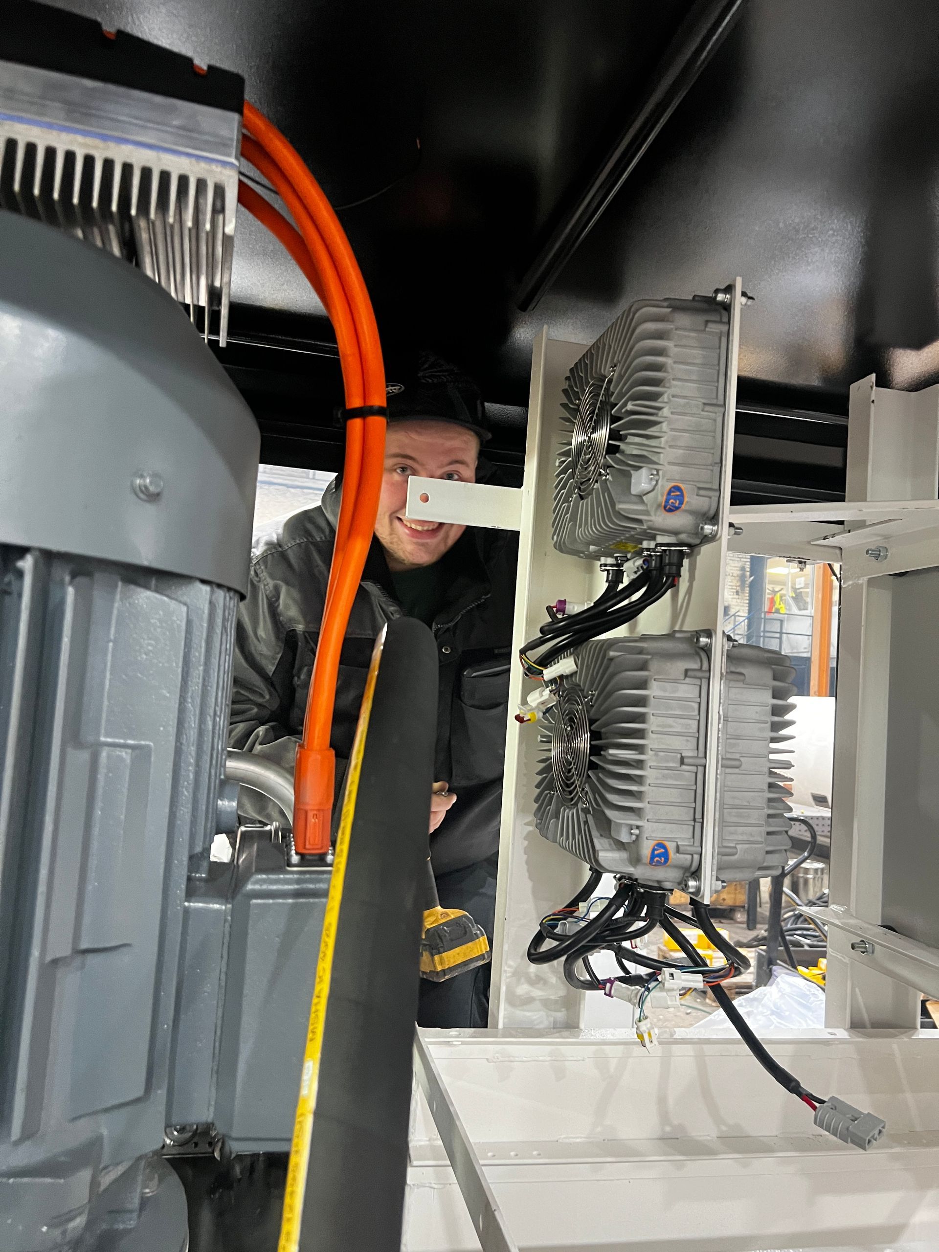 Zukünftig müssen Arbeitsmaschinen im Tunnelbau möglichst ohne Benzin oder Diesel fahren. Wir haben mit unserem Partner einen Hubkorbwagen gebaut, der sowohl mit Akku als auch mit Starkstrom genutzt werden kann. Eine andere Art von Hybridfahrzeug. Ein Motor, zwei Steuerungen. Das perfekte Arbeitsgerät im Tunnelbau.